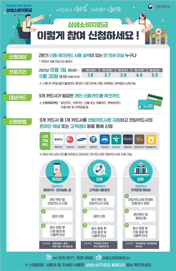 시행시기는 10. 1일부터 2개월 간 시행하며, 재원 소진 시에는 조기 종료될 수 있다. 사업규모는 7천억 원이며, 지원대상은 만 19세 이상 (2002년12월31일 이전 출생자)이고, 금년 2분기 중 본인 명의 신용‧체크카드 사용실적이 있는 자이다.