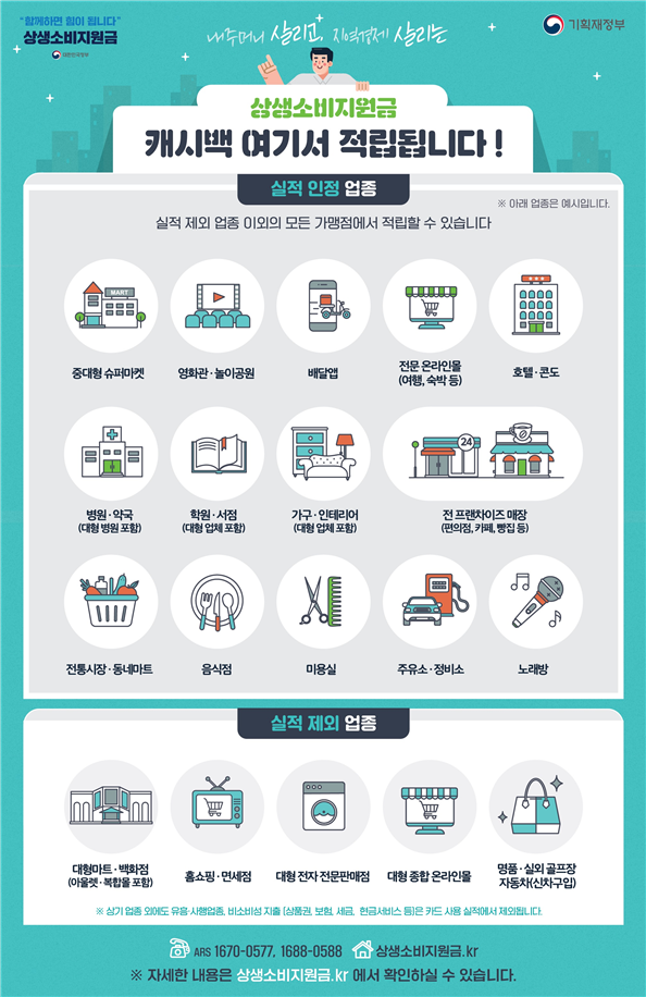 금일(9.27일)부터 통합 콜센터 가동, 전용 웹페이지 운영 등을 통해 국민들께 사업내용 상세히 안내된다. 전용 웹페이지(상생소비지원금.kr)를 통해서는 사업전반에 대한 내용, 사용 가능‧제한 업종 등을 상세히 확인 가능하다.