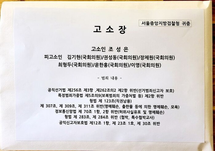 이와 같은 이들의 중대한 위법한 행위는 선출직이자 헌법기관이며 법정 공익신고 대상기관으로서 국회의원의 신분에 있는 자가 공익신고 및 선거범죄 신고를 한 고소인 조성은에 대해, 그 직에 관한 범죄 중 역대의 어느 범죄의 위법성보다 중하고 그 법익 훼손이 월등하게 크기에 강력한 법의 심판을 받아 마땅합니다.