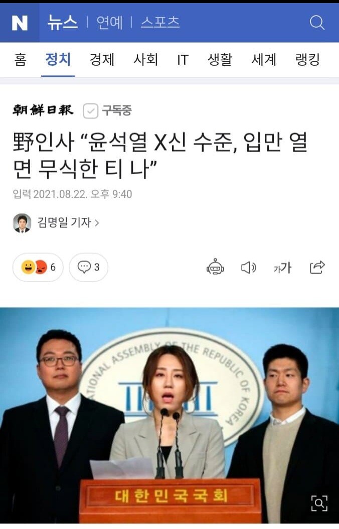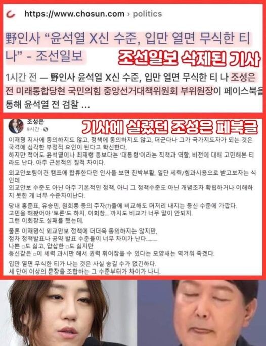 지난 22일 저녁 조선일보는 [野인사 “윤석열 X신 수준, 입만 열면 무식한 티 나”] 제목의 기사를 내고 곧바로 삭제 조치했다. 하지만 네티즌들이 빛의 속도로 박제해 그 내용이 전파됐다.