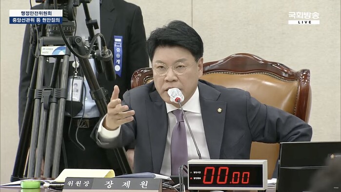 장 위원장은 조은희 국민의힘 의원 질의에 힘을 실으며 박찬진 중앙선관위 사무총장을 압박하던 중 부적절한 진행으로 야당 의원들의 항의가 이어지자 언성을 높였다.