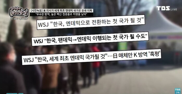 5일 오전 김어준의 뉴스공장에서, 미국 월스트리트 저널지가 코로나 19가 팬데믹에서 엔데믹으로 전환되는 세계 최초의 국가는 한국이 될 것이다 라는 보도를 했다고 전하며 캘리포니아대 의과대학 전염병 전문의 모니카 간디교수 전망을 직접 연결을 해서 인터뷰를 진행했다.