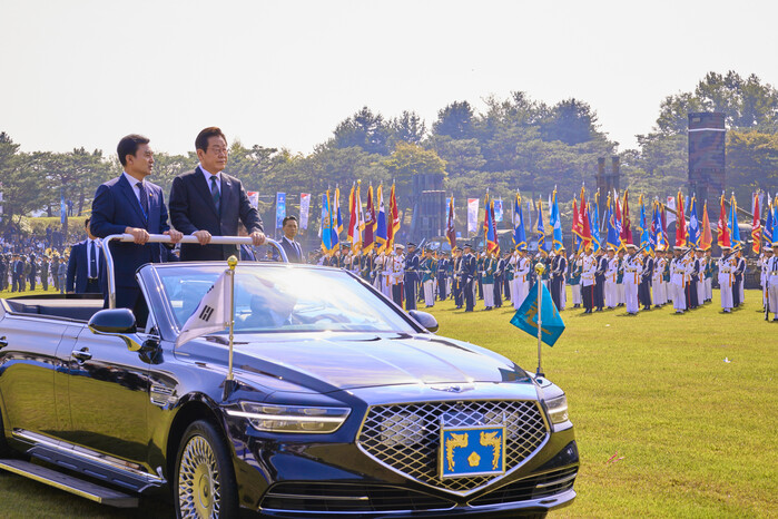 | ▲ 이재명 대통령이 1일 충남 계룡대 대연병장에서 열린 건군 77주년 국군의 날 기념행사에서 열병 차량에 탑승해 사열하고 있다. 2025.10.1 [대통령실 제공. 재판매 및 DB 금지] (제공=연합뉴스) |