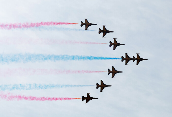| ▲ 공군 특수비행팀 '블랙이글스'가 1일 충남 계룡대에서 열린 건군 77주년 국군의 날 기념행사에서 고난도 기동비행을 하고 있다. 2025.10.1 (사진=연합뉴스) |