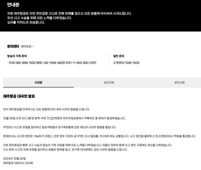29일 제주항공 홈페이지에 따르면, 탑승자 명단에 대한 문의는 국내 080-898-1500, 해외 +82-1599-8629, 미주 +1-833-892-0197에서 안내된다. 이를 통해 사고 항공기에 탑승한 사망자, 생존자 및 탑승자 명단을 확인할 수 있을 것으로 보인다.