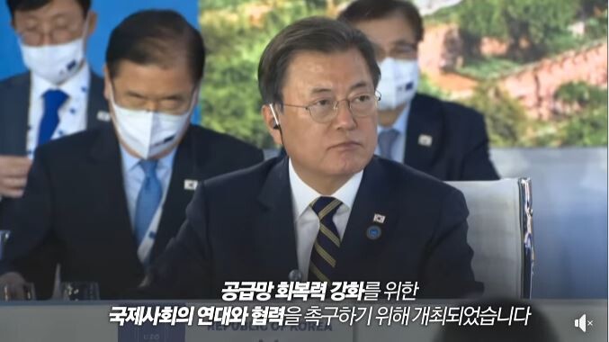 바이든 대통령 개회사에 이어 첫 번째 발언자로 나선 문 대통령은 “세계 경제는 글로벌 공급망을 통해 하나의 사슬로 긴밀히 연결, 모든 나라의 경제 활동이 정상 궤도로 복귀할 때까지 글로벌 공급망 불안은 계속될 수밖에 없다’며 “기업들이 자유로운 교역과 투자를 통해 더욱 촘촘한 공급망을 구축할 수 있도록 개방적이고 공정한 무역 질서를 복원해야 한다”고 촉구했다.