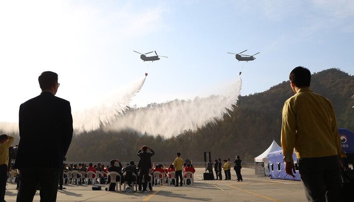 | ▲ 강원도 원주 산림항공본부에서 산불진화 관ㆍ군 합동훈련을 하고 있다. 이날 훈련은 이재명 대통령이 참관했다. 2025.11.6 (사진=연합뉴스) |