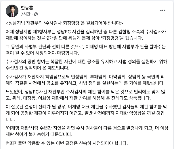 한동훈 대표는 12일 페이스북을 통해 "어제 성남지법 제1형사부는 성남FC 사건을 심리하던 중 다른 검찰청 소속의 수사검사가 재판에 참여하는 것을 9개월 만에 뒤늦게 문제 삼아 ‘퇴정명령’을 했다"며 "그 동안의 사법부 판단과 전혀 다른 것으로, 이재명 대표 방탄에 사법부가 판을 깔아주는 격이 될 수 있어 시정되어야 마땅하다"고 말했다.
