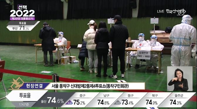 중앙선거관리위원회는 이날 오후 5시 현재 대선 투표율이 73.6%로 집계됐다고 밝혔다. 이 시각까지 대선 총선거인 수 4419만7692명 중 3251만5203명이 투표를 마쳤다.