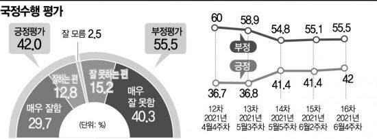 문 대통령의 직무 수행 긍정 평가의 이유로는 코로나 대처와 외교·국제관계, 복지 확대 등이 꼽힌다. 코로나19 백신 1차 접종률에 속도가 붙으면서 상반기 30%라는 목표치에 근접해 ‘11월 집단면역’ 가능성에 힘이 실리는 것도 한 몫한 것으로 보인다. 특히 문 대통령의 국제관계 외교력을 평가받고 있는 7개국(G7) 정상회의 역시 크게 영향을 미쳤을 것으로 풀이된다.