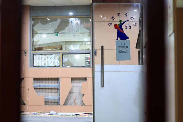 | ▲ 19일, 내란수괴 윤석열이 구속되자 지지자들이 서부지법에 난입해 일으킨 폭동으로 창과 외벽이 파손돼 있다. (사진=연합뉴스) |