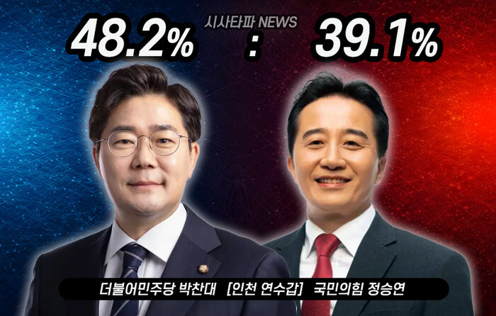 4‧10 총선 인천 연수구 갑 선거구에 출마하는 더불어민주당 박찬대 후보가 국민의힘 정승연 후보를 오차범위 밖에서 앞선다는 결과가 나왔다.