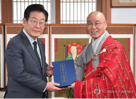 | ▲ 24일 조계종 총무원장 진우 스님과 이재명 더불어민주당 대표 (사진=연합뉴스) |