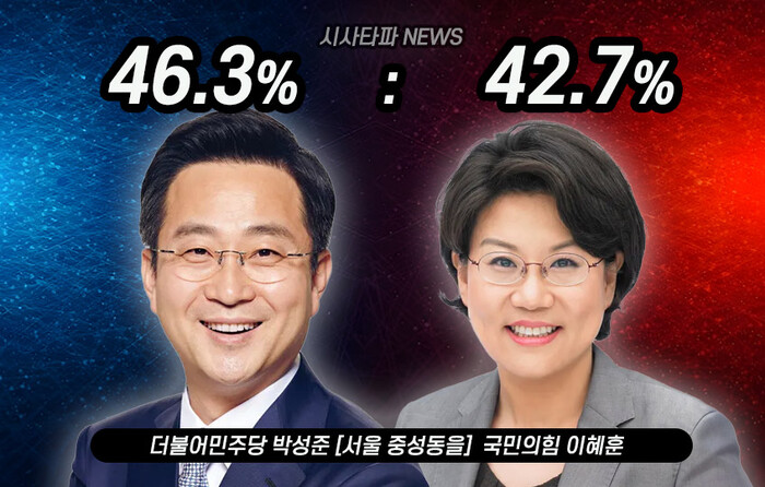 서울 중성동을 4·10 총선 가상대결 조사에서 박성준 더불어민주당 후보가 이혜훈 국민의힘 후보와 오차범위 안에서 박빙양상을 보이고 있다는 여론조사 결과가 나왔다.