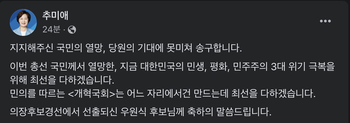 추 당선인은 이날 오후 페이스북 글을 통해 이같이 경선 패배 입장을 밝혔다.