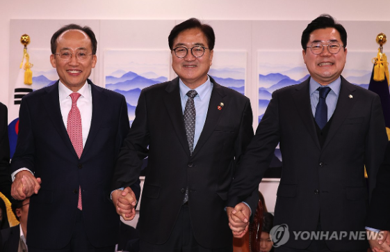 | ▲ 여야 원내대표 회동, 왼쪽부터 추경호 국힘 원내대표, 우원식 국회의장, 박찬대 민주당 원내대표 (사진=연합뉴스) |
