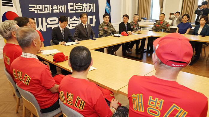 | ▲ 해병대 예비역 면담하는 조국 대표(사진=연합뉴스) |