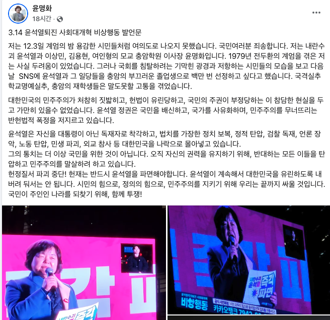 | ▲ 14일 집회에서 발언한 윤명화 충암고 이사장의 게시글 (출처=윤명화 페이스북) |