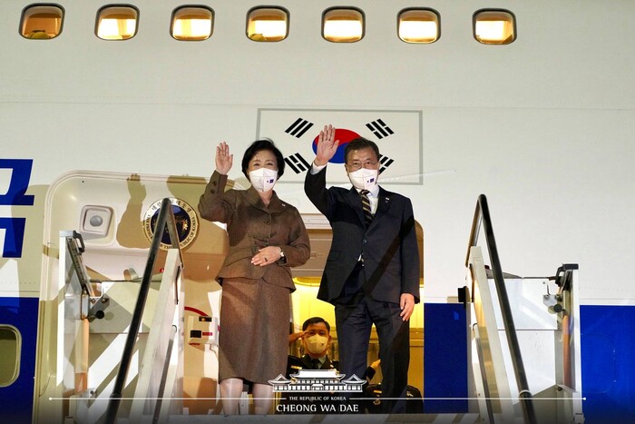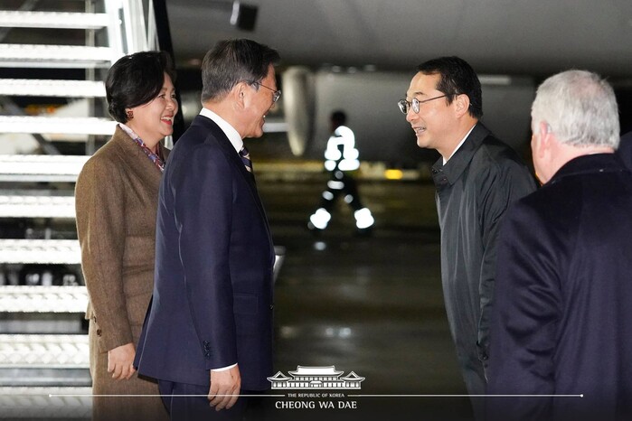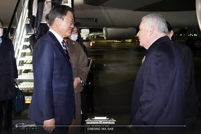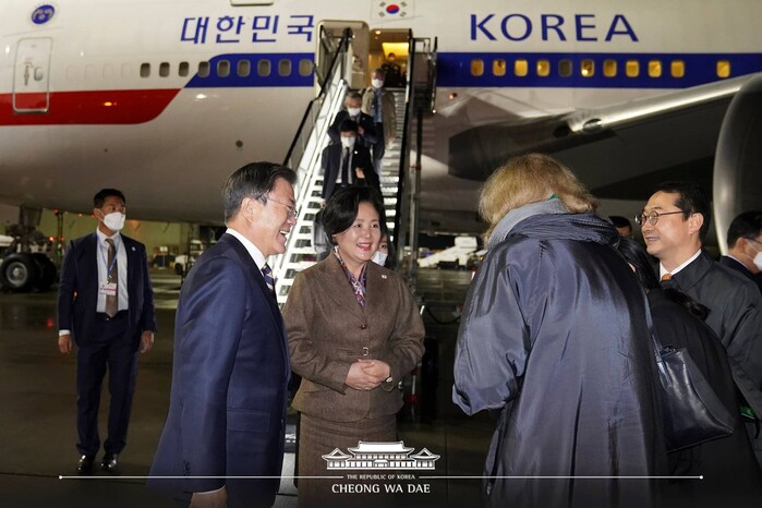 문 대통령 부부는 버틀러 영국 외교부 대표, 로스 영국여왕실 법률 담당, 김건 주영국 대사의 환영을 받고 인사를 나눴다.