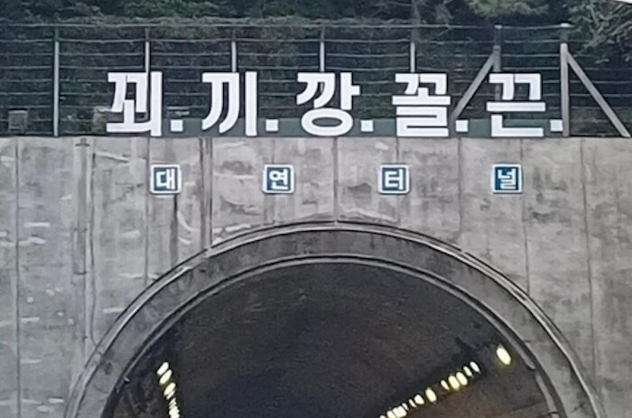 23일 부산 번영로 대연 터널 입구 상단에 '꾀·끼·깡·꼴·끈'이라는 문구가 설치돼 논란을 일으켰다.