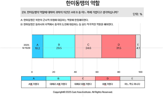 결국 우리 국민들은 '미국은 싫지만, 중국은 더 무섭다'는 딜레마 속에서 '울며 겨자 먹기' 식의 선택을 하고 있었다. 미국에 대한 불신에도 불구하고, '한미동맹의 역할 확대'(56.1%)와 '한미일 군사안보협력 강화'(78.8%)에는 압도적으로 찬성하는 모순적인 결과가 나온 것이다.