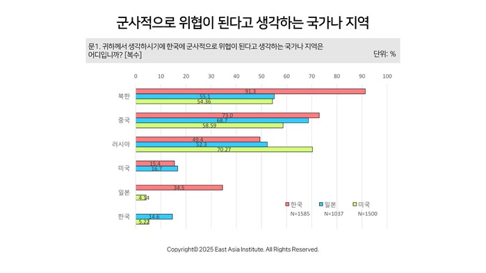 하지만 미국에 대한 불신이 중국에 대한 경계심 완화로 이어지지는 않았다. 오히려 "중국이 군사적 위협"이라는 응답은 73%에 달했고, '대만해협에서 중국의 군사충돌 가능성'에 동의한 비율도 72.1%로 미국이나 일본보다 월등히 높았다.