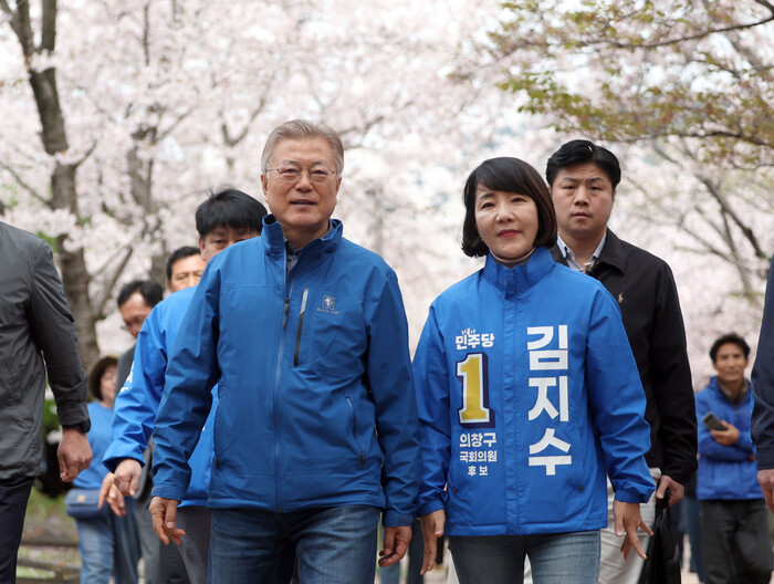 문 전 대통령은 앞서 이날 오전 김지수(창원 의창) 후보 지원을 위해 찾은 국립창원대에서 “투표해야 세상이 바뀐다. 사전투표 참여해달라”고 학생들을 독려했다.