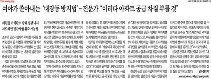 <중앙일보>도 지난 24일 <"민간이익 10%로 제한" 대장동 방지법에… "공급 절벽 온다">라는 제목의 기사에서 소위 전문가들의 우려를 자세하게 소개했다. 인용된 부동산학과 교수들은 민간업자들의 폭리를 막으면 아파트 공급이 부족해진다고 입을 모았다.