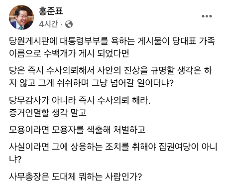 홍 시장은 12일 자신의 페이스북에 "당원 게시판에 대통령 부부를 욕하는 게시물이 당 대표 가족 이름으로 수백개가 게시됐다면, 당은 즉시 수사 의뢰해서 사안의 진상을 규명할 생각은 않고 쉬쉬하며 그냥 넘어갈 일이더냐?"라는 글을 게시했다.