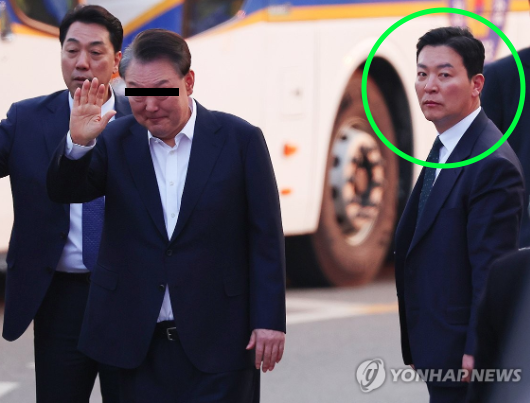 | ▲ 8일 석방된 윤석열과 밀착 경호하는 김성훈 경호차장 (원본=연합뉴스 |