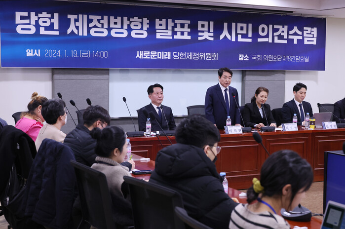 새로운미래는 19일 국회 의원회관에서 열린 '당헌 제정 기본 방향 발표 및 시민 의견 수렴 간담회'를 열고 당내 민주성을 강화하기 위해 당대표 권한을 축소하는 방향으로 당헌을 제정한다고 밝혔다.