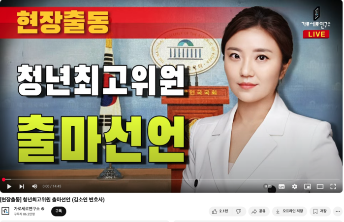 더욱이 김 변호사는 보수 유튜브 '가로세로연구소'에 방송출연을 하며 김세의 측 변호를 맡으며 정치 입문을 모색해온 것으로 알려진다.