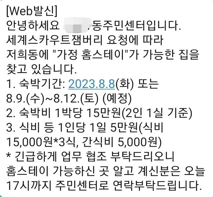 구로구 등은 이날 오후 주민들에게 "세계스카우트 잼버리 요청에 따라 '가정 홈스테이'가 가능한 집을 찾고 있다'는 문자 메시지를 보냈다. 메시지에 따르면 숙박 기간은 8일, 9일부터 잼버리 대회가 종료되는 12일까지다.