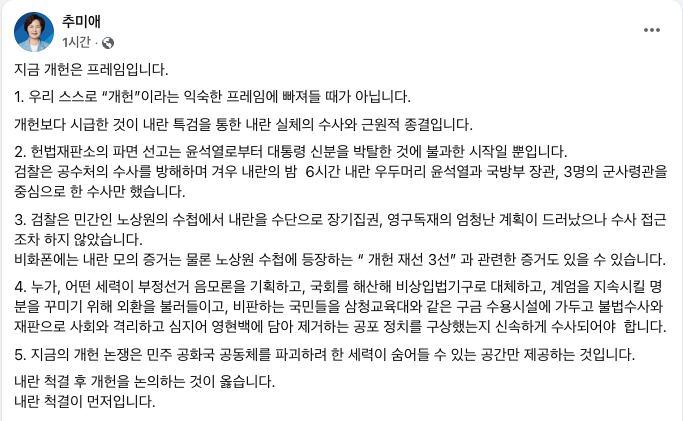 추미애 의원도 SNS에 “지금 개헌 논쟁은 민주공화국 공동체를 파괴하려 한 세력이 숨어들 수 있는 공간만 제공하는 것”이라며 "내란 척결 후 개헌을 논의하는 것이 옳다" 라고 주장했다.