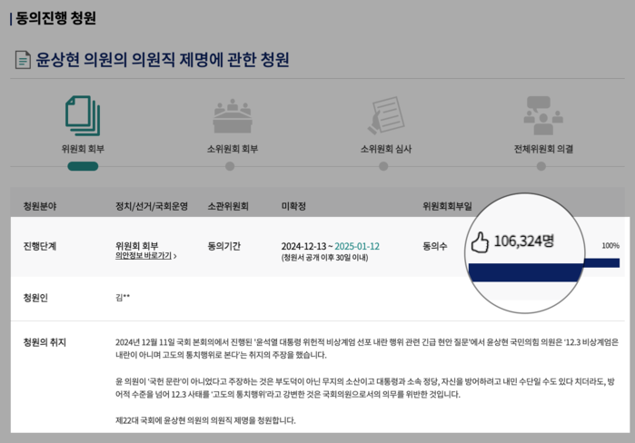 청원은 2024년 12월 13일부터 2025년 1월 12일까지 진행되며, 동의 기간 30일 내 동의자 수가 10만 명을 돌파하며 101,343명을 기록했다. 청원은 현재 국회 소관위원회에 회부된 상태다.