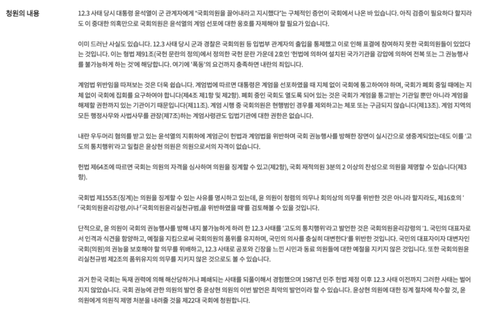 12.3 사태 당시 상황에 대한 설명도 포함됐다. 청원인은 "윤석열 대통령이 계엄을 선포하고 군과 경찰을 동원해 국회의 권능 행사를 방해했다는 의혹이 제기됐다"며, "국회의원들의 표결 참여가 저지당하는 상황이 실시간 생중계되었음에도 이를 옹호한 윤 의원은 국회의원으로서 자격이 없다"고 지적했다.