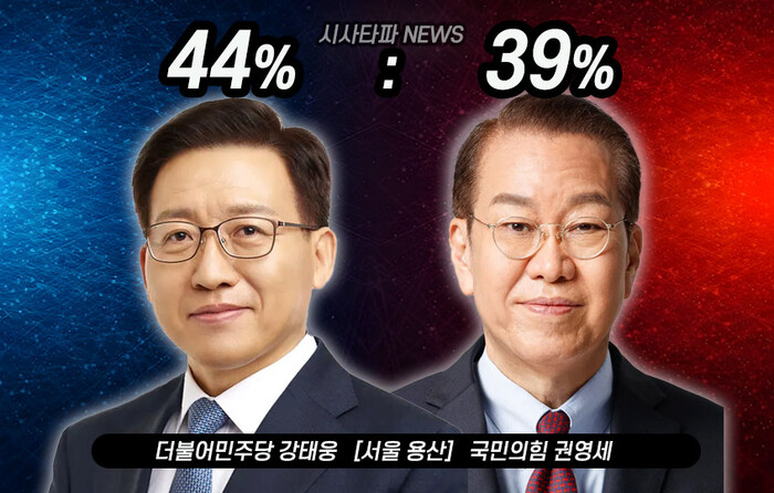 27일 JTBC 의뢰로 25~26일 용산 유권자 502명을 대상으로 국회의원 후보 지지도를 조사한 메타보이스의 여론조사 결과 강태웅 더불어민주당 후보가 44%, 권영세 국민의힘 후보가 39%로 나타났다.