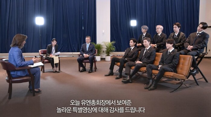 유엔측은 먼저 문 대통령에게 BTS를 특사로 임명한 배경과 기대, 그리고 SDG 모멘트에 BTS와 함께 참석한 이유를 물었다. 이에 문 대통령은 "지속가능발전은 미래세대에 매우 중요하고, 또 미래는 미래세대의 것"이라며 "지속가능발전목표(SDG) 달성에 실패하면 미래세대가 그 고통을 전적으로 짊어져야 하므로 미래세대가 지속가능발전목표 달성에 참여하고 적극적으로 목소리를 내야 한다"는 말했다.