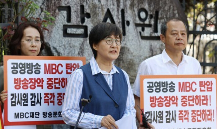 | ▲감사원에서 기자회견하는 방문진 이사들 (사진=연합뉴스) |