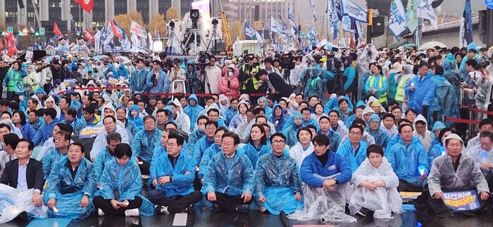 16일 서울 광화문 앞 도로에서 더불어민주당과 조국혁신당, 진보당, 기본소득당, 사회민주당 등 야 5당이 연 국민행동의 날 집회에서 이 대표는 “어떤 어려움이 있더라도 결코 포기하거나 좌절하지 말고 두손 함께 꼭 잡고 제대로 된 세상, 제대로 된 이 나라를 위해서 함께 싸워나가자”고 말했다.