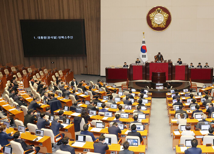 | ▲ 14일 국회 본회의장에서 윤석열탄핵소추안을 가결하고 있다. (사진=연합뉴스) |