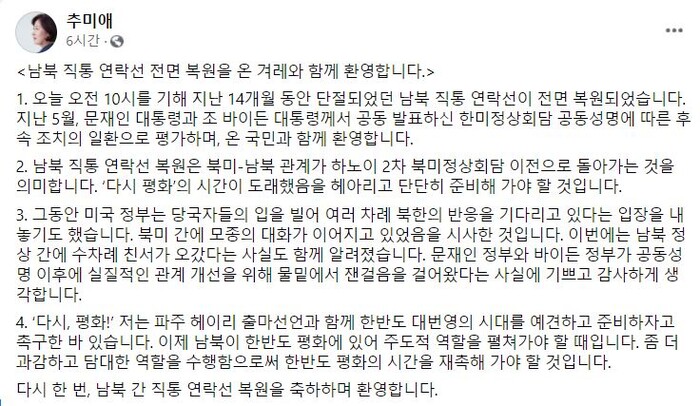다시 한 번, 남북 간 직통 연락선 복원을 축하하며 환영합니다.