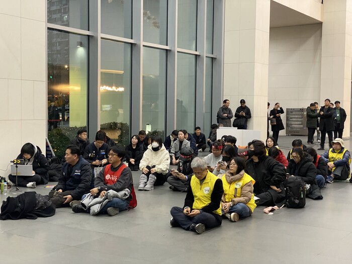 | ▲ 쿠팡 로비 본사에서 집회 중인 시위대 (사진=연합뉴스) |