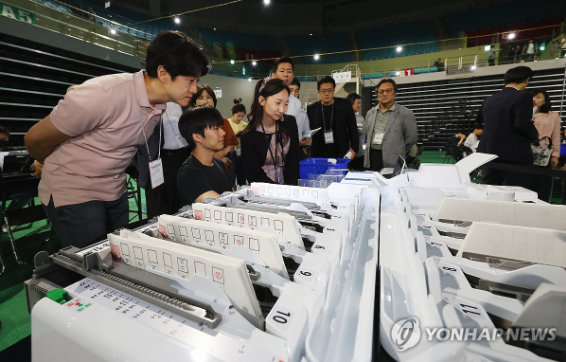 | ▲ 제21대 대통령선거를 하루 앞둔 2일 인천 부평구 삼산월드체육관에 설치된 개표소에서 공정선거참관단이 투표지분류기 모의시험을 지켜보고 있다. 2025.6.2 (사진=연합뉴스) |