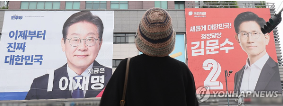 | ▲ 제21대 대통령선거를 하루 앞둔 2일 경기도 의왕시 한 건물에 더불어민주당 이재명 후보와 국민의힘 김문수 후보 대형 현수막이 걸려 있다. 2025.6.2 (사진=연합뉴스) |