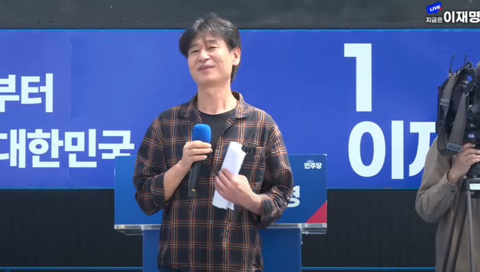 | ▲ 더불어민주당 이재명 후보의 제주 연설에서 지지 발언하는 배우 박혁권 2025.5.22 (출처=델리민주) |
