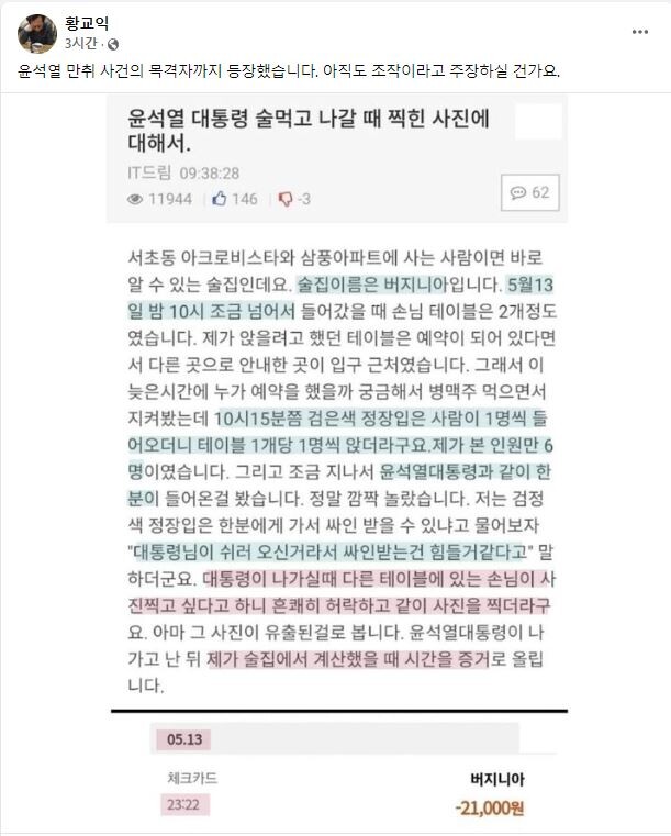 | ▲ 만취 윤석열 대통령실의 해명에 증거 인증샷 올라와 - 맛칼럼니스트 황교익씨의 페이스북 |