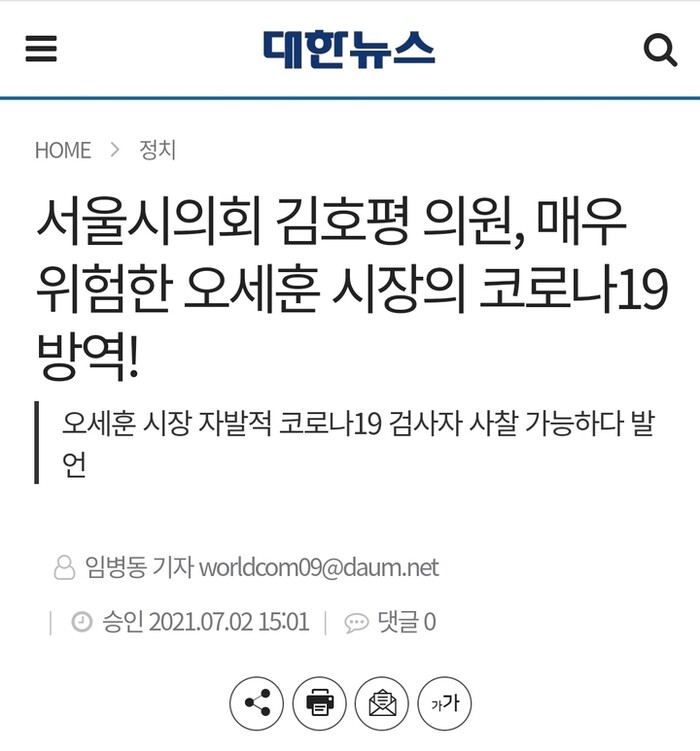 -김호평 시의원 "오세훈 시장 공약이행에 몰두해" 코로나 방역 소홀,확진자 급증.