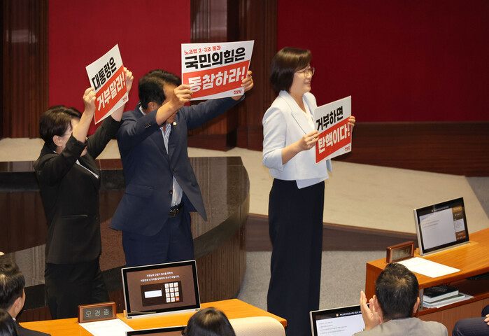 이들이 '국민의힘도 동참하라', '대통령은 거부 말라', '거부하면 탄핵이다' 피켓을 들고 구호를 외치자 국민의힘 의원들은 큰 소리를 내며 항의했다.