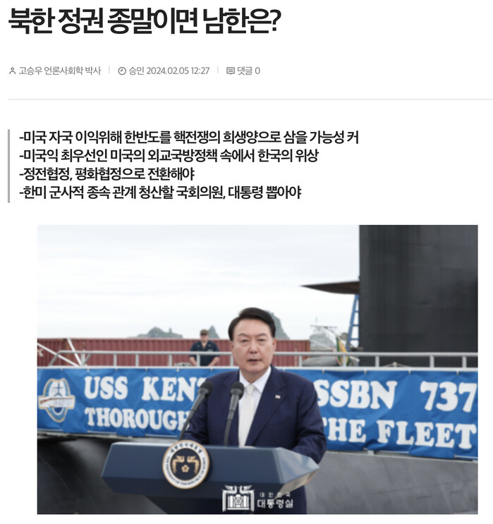 유일하게 ‘현장언론 민플러스’가 「북한정권 종말이면 남한은?」(2024.02.05.)이라는 기사에서 한반도 전쟁에 대한 경각심을 불러오고 있다.